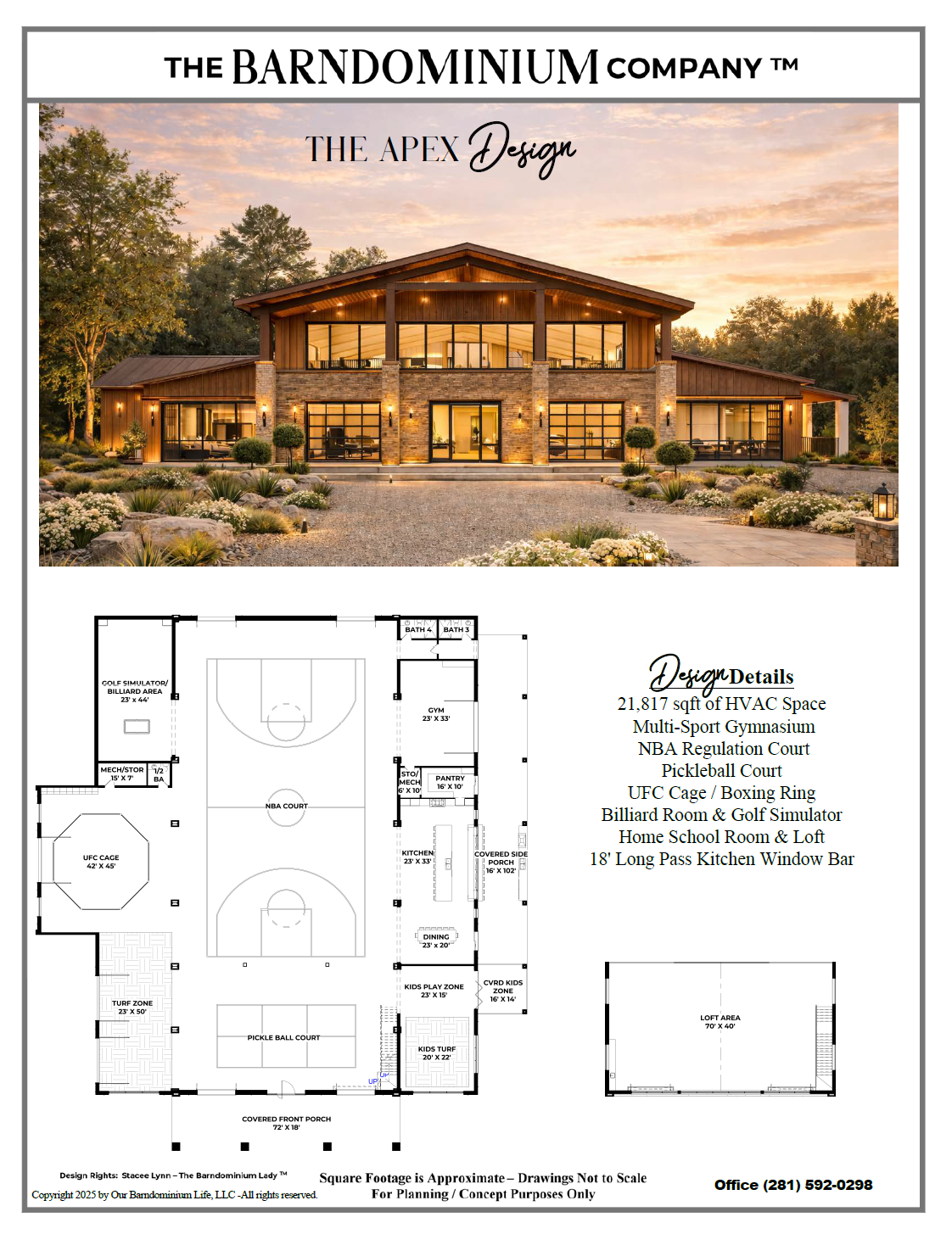 The Apex is the ultimate play space – no sleeping areas here but they could be added if desired. With multiple courts, a gym, and a simulator area, this Barndo has it all.